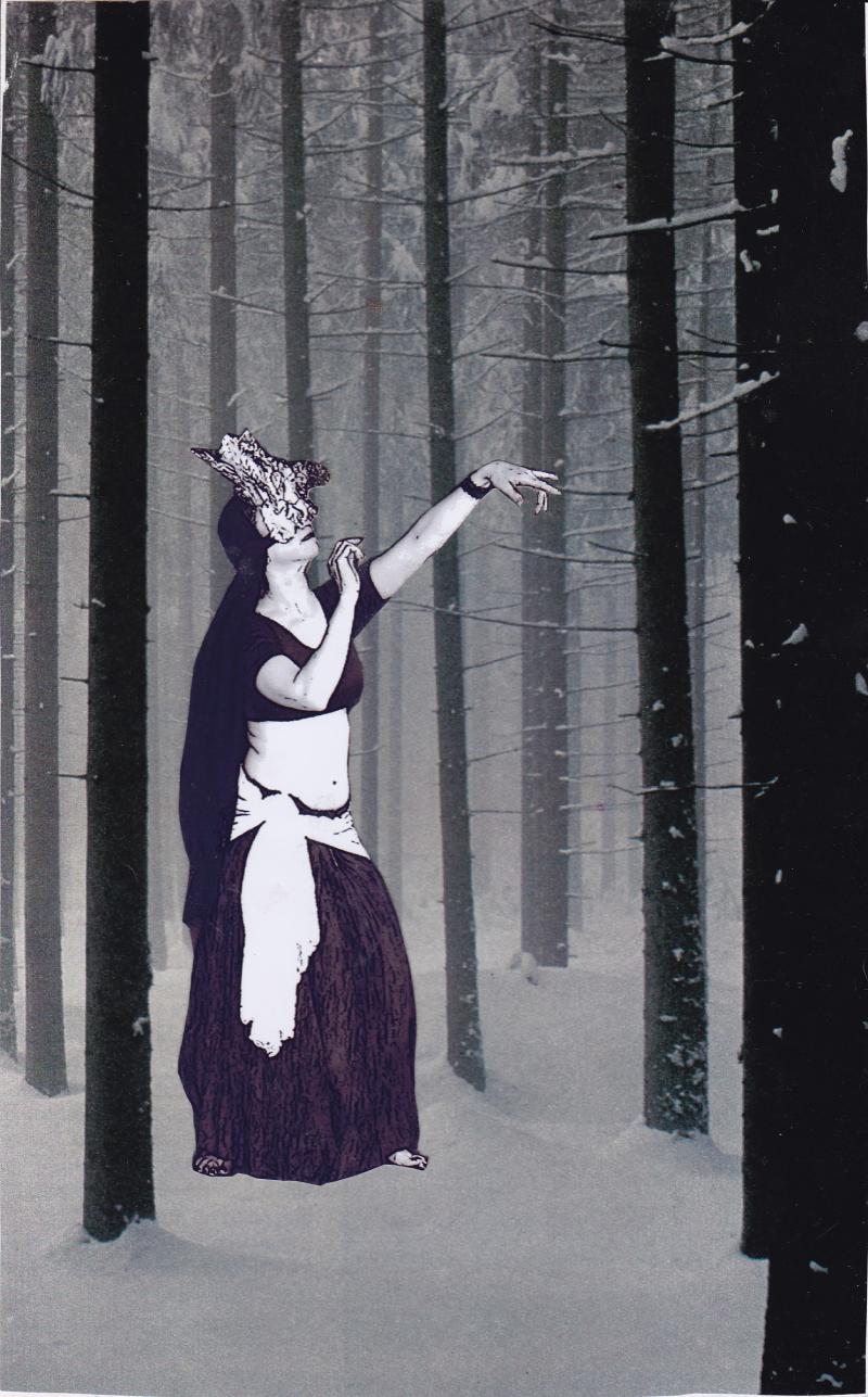 To the left are samples of Archetype Poses and SoulCollage® Cards created using the poses. I used Spring and Winter masks created by artist Donald Walker. I also dressed in costuming for the poses. For the Spring collage card, I used pictures of flowers and hastas from my yard. Winter dancer photo by Donald Walker.