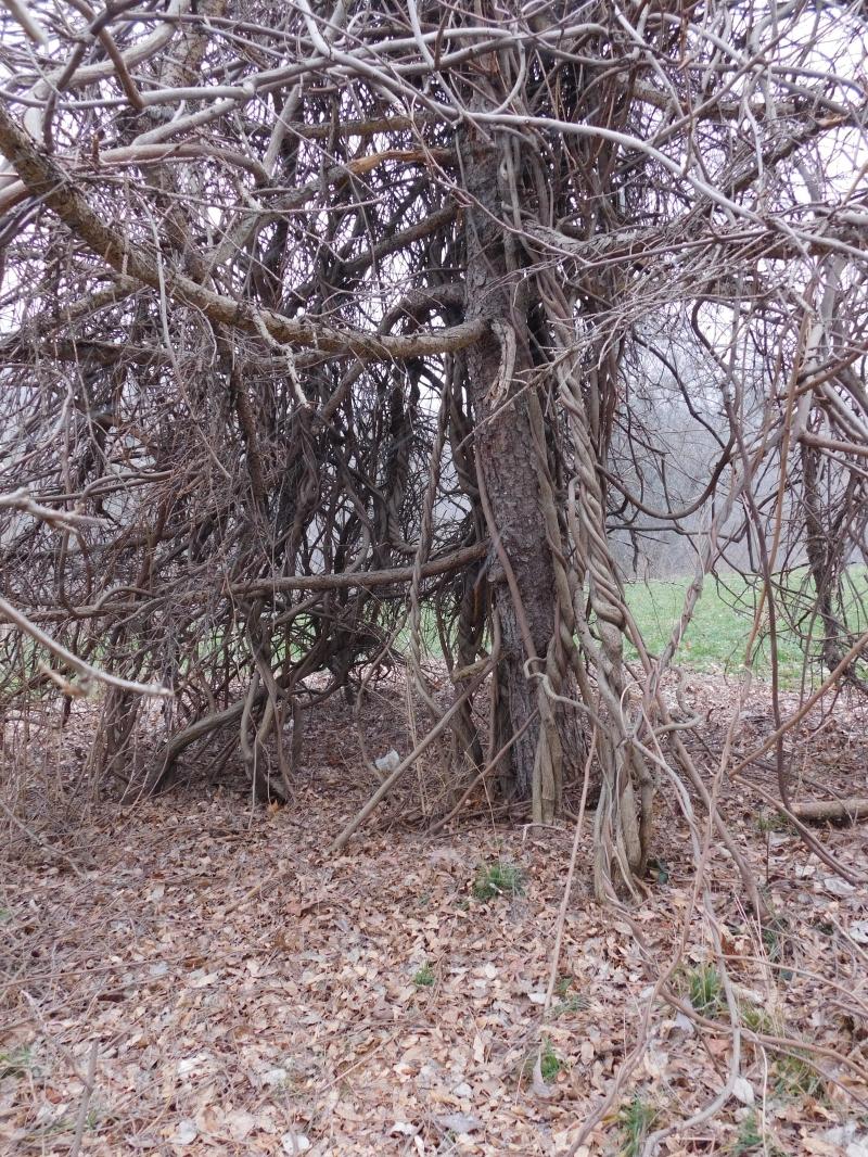 Can't see it well in photo above, but in person, there is room for someone to sit under this. there are interesting twining branches throughout. Could also curl around trunk.